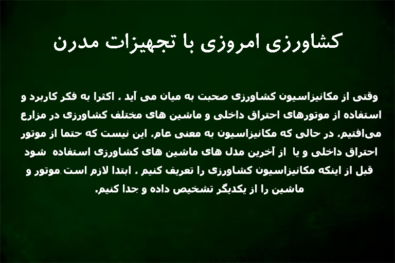 وقتی از مکانیزاسیون کشاورزی صحبت به میان میآید، اکثرا به فکر کاربرد و استفاده از موتورهای احتراق داخلی و ماشین های مختلف کشاورزی در مزارع می افتیم ، در حالی که مکانیزاسیون به معنی عام، این نیست که حتما از موتور احتراق داخلی و یا از آخرین مدل های ماشین های کشاورزی استفاده شود. قبل از اینکه مکانیزاسیون کشاورزی را تعریف کنیم، ابتدا لازم است موتور و ماشین را از یکدیگر تشخیص داده و جدا کنیم.